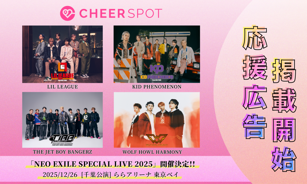 LDHからNEO EXILE(LIL LEAGUE、KID PHENOMENON、THE JET BOY BANGERZ、WOLF HOWL HARMONY)が、本日12月12日(金)よりCheerSPOTに常時掲載が開始いたします!