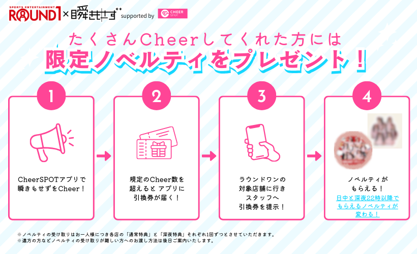 【概要】CheerSPOTユーザーによる、アイドルグループ「瞬きもせず」へのアプリ内応援(Cheer)の累計数に応じて、ラウンドワン店舗内でのイベント開催企画を展開いたします。(※1)